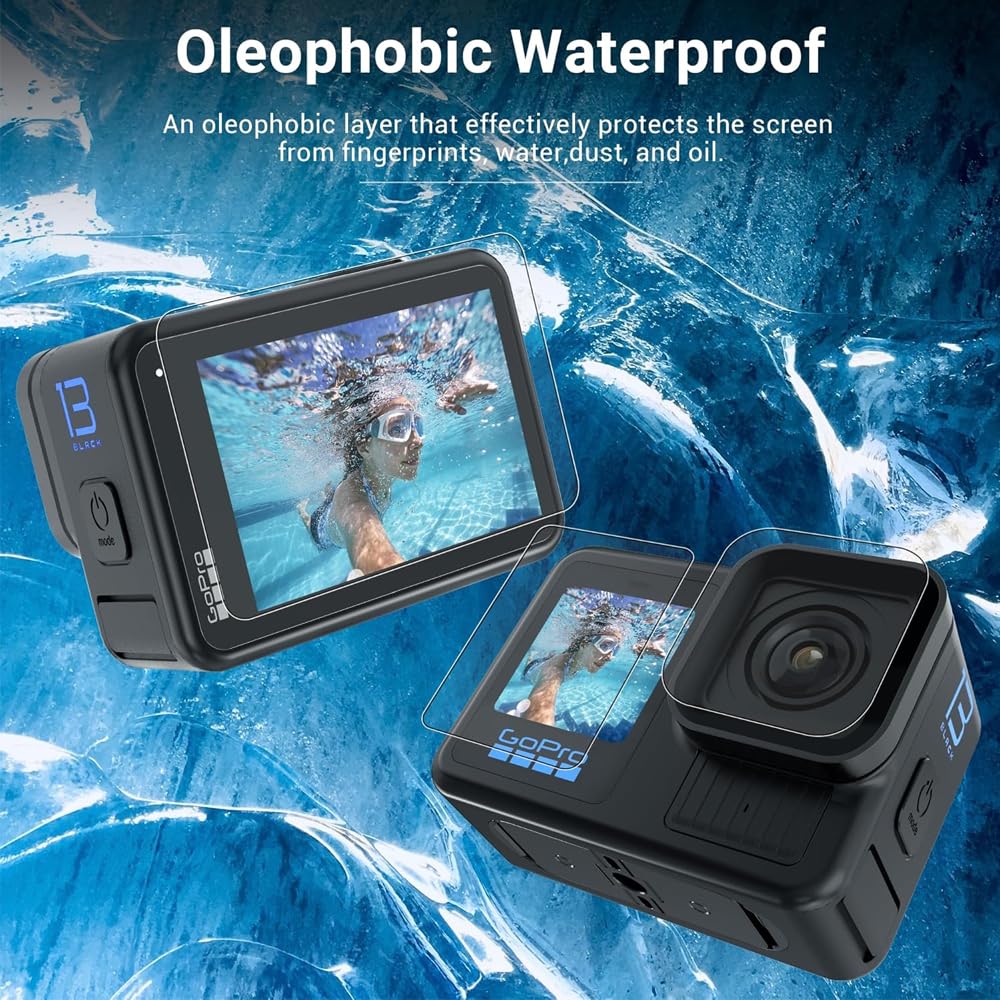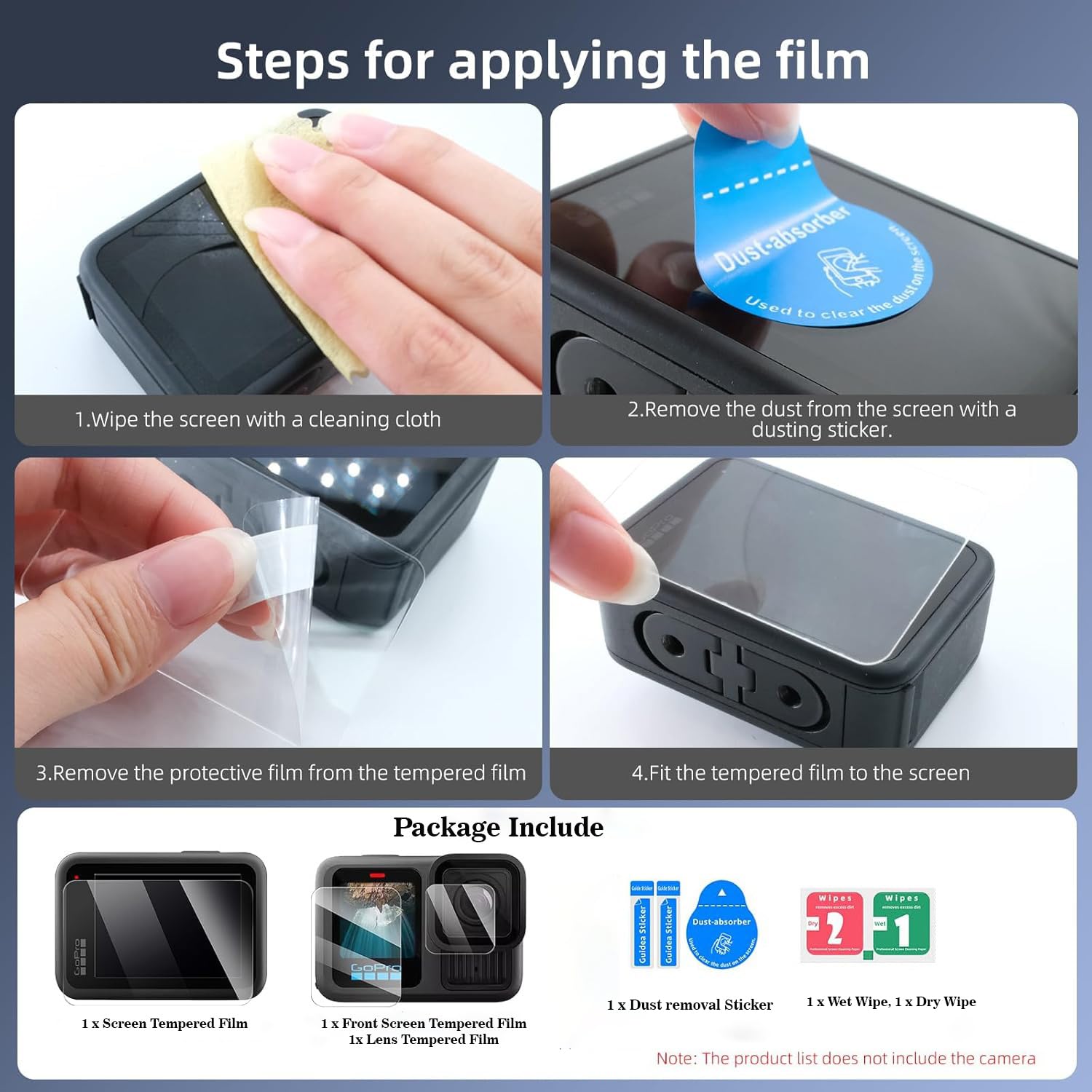 【Accessories designed for GoPro 13】This 13 hero black screen protector kit is only designed for Gopro Hero 13 Black,Package Include: 1 x Front Screen tempered glass,1 x lens tempered glass, 1 x Back Screen Tempard glass, 1 x Wet Wipe,1 x Dry Wipe,1 x Dust absorber Stiker.