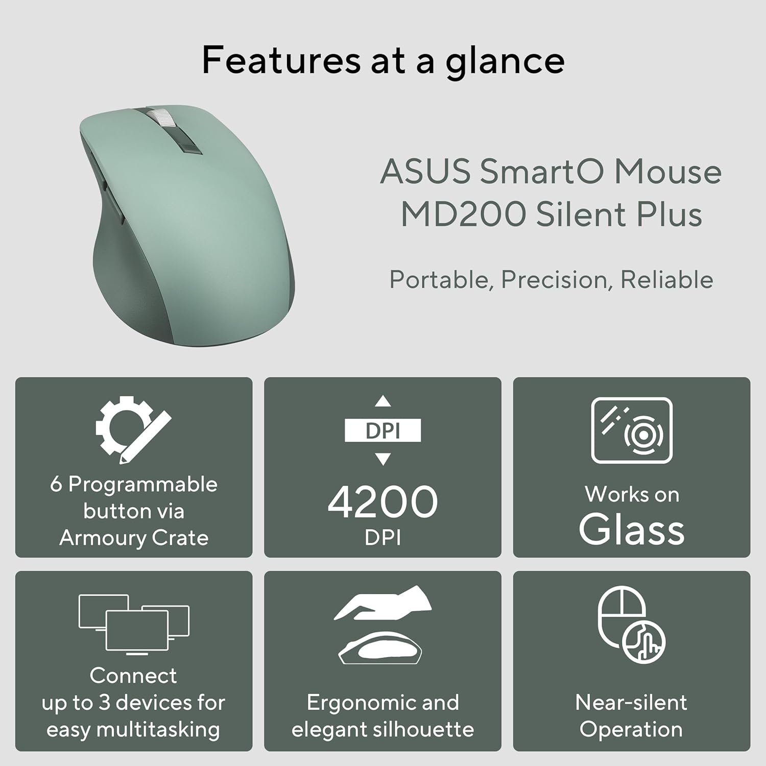 Exudes executive style and is available in Green Tea Latte. It is engineered with a strong, tactile aluminum scroll wheel and two side buttons to extend your control. Right below these is a thumb rest that provides a comfortable bed for your opposable digit and allows ASUS SmartO Mouse Silent Plus to cast an elegant silhouette.