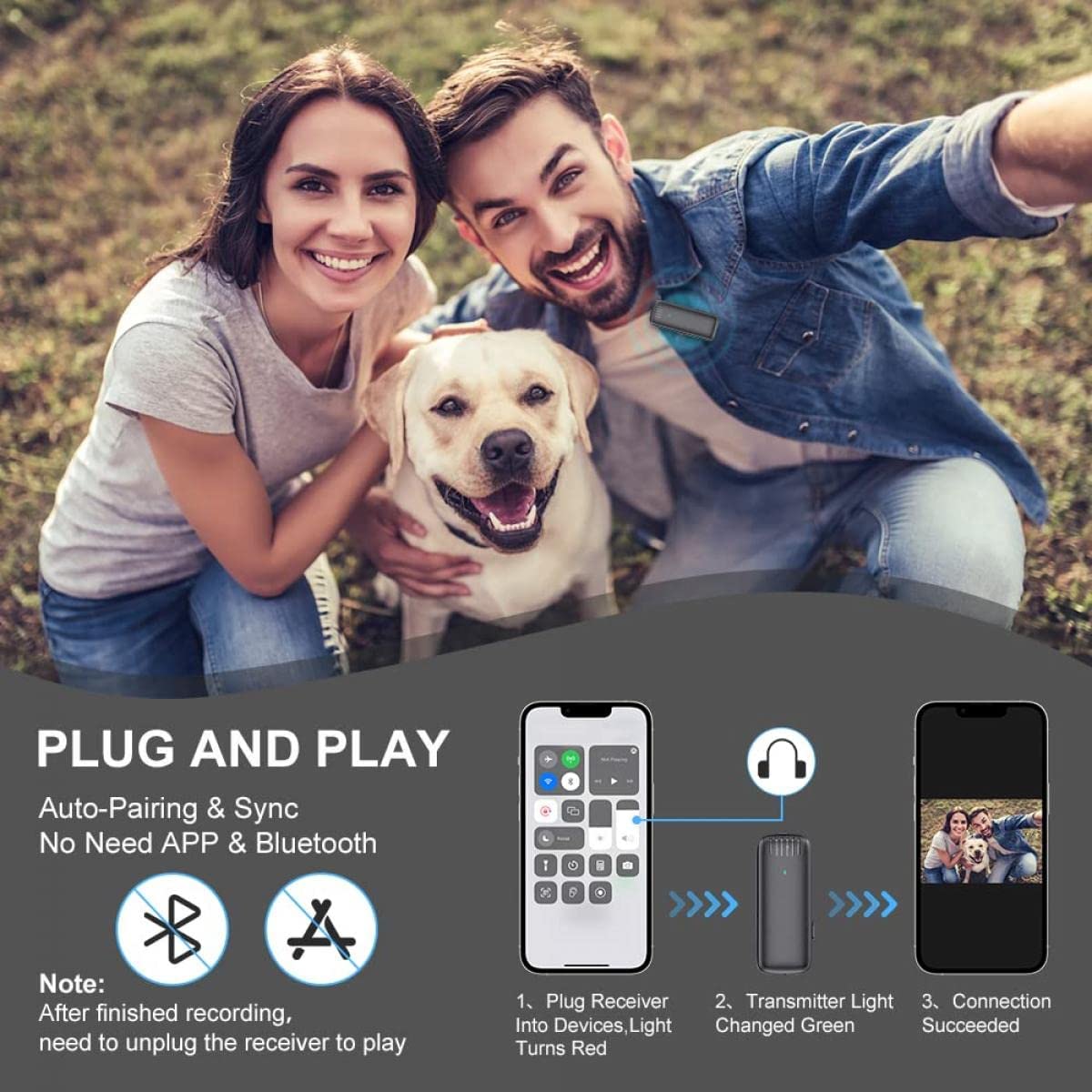【PLUG & PLAY AND AUTO PAIRING】- No App or Bluetooth WiFi needed, The Wireless Lapel Microphone,just clip the microphone to your collar and plug the receiver on your iOS devices,they will automatically connect.Just plug and play directly, Lapel Mic is easy for you to play with YouTube/Facebook Live Streaming, TikTok, Vlog, Blog, Podcast, Zoom, Interview and other video recording.