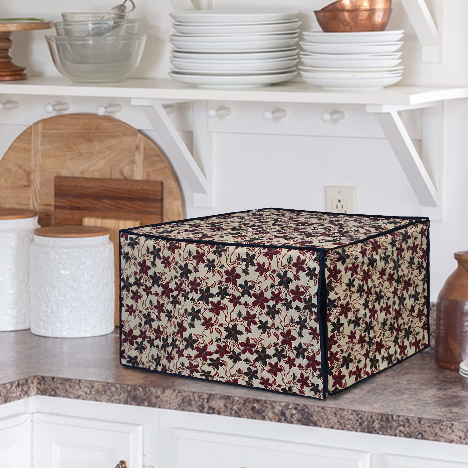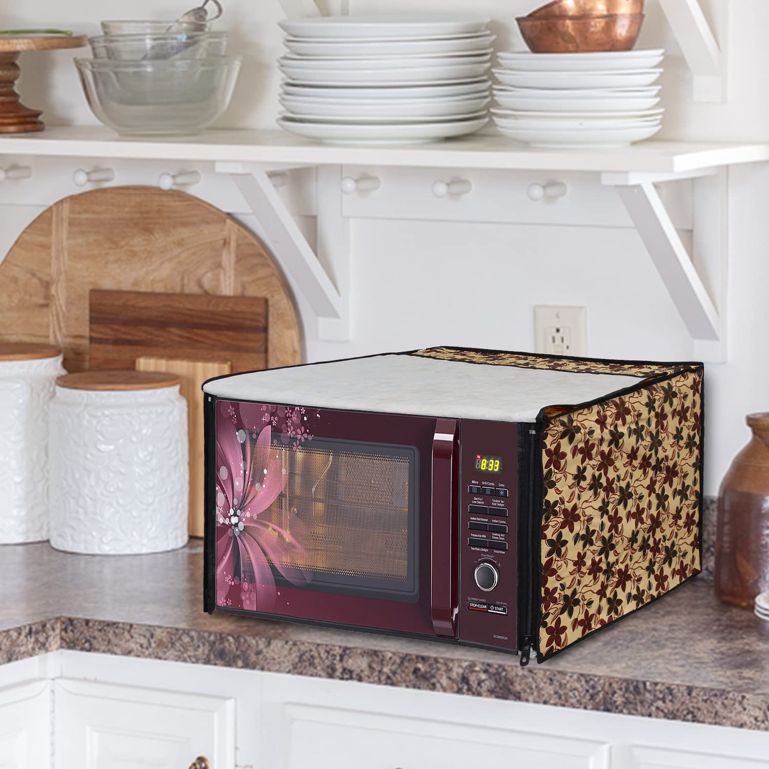 It Covers Your Microwave oven from all four sides To protect it from unwanted Particles and Dust.This protects your oven surface from scratches, dust, stains and other particles. This has two zipper enclosures at front side. The design and look is elegant and very attractive which increase the beauty of your kitchen interior.