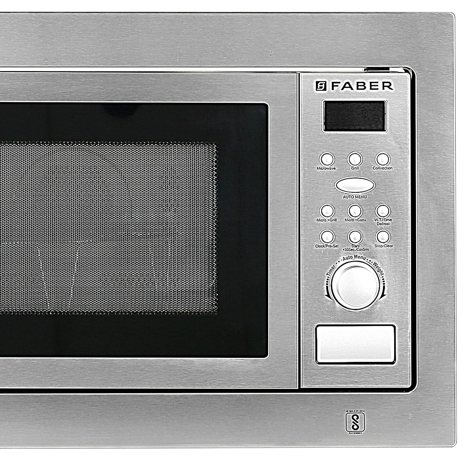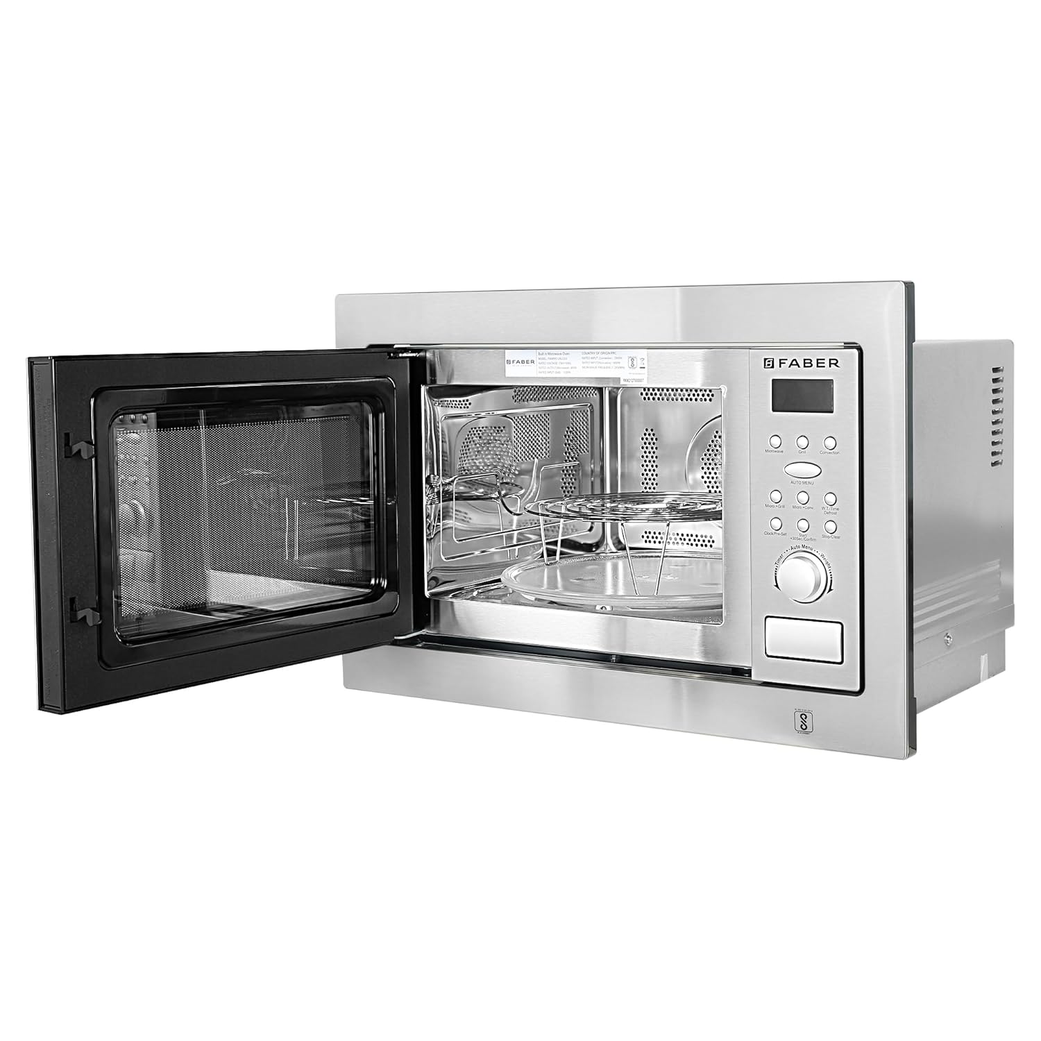 Faber-Stainless Steel Finish, 25 Ltr Grill + Convection,Electric Control, Child Safety Control,10 Auto Cooks Menus, Temperature range : 50°–250°C,Combination Cooking, Multi Stage Cooking, Pre-Set Function, Speedy Cooking, Speedy Microwave Cooking, Inquiry Function,Oven Size – WxDxH (mm) : 594x470x388.