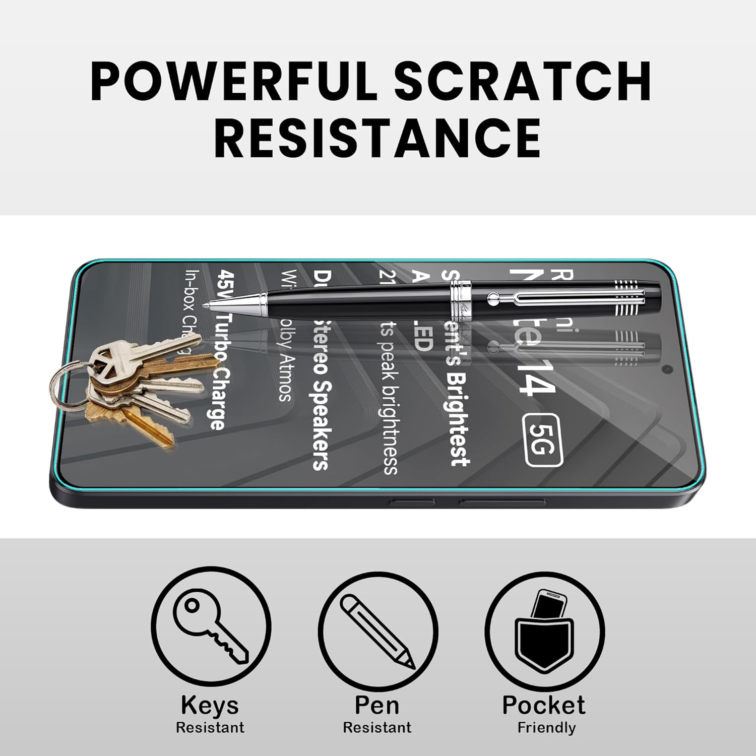 Scratch proof: This Redmi Note 14 full tempered glass provides the 9H Hardness screen protector can effectively protect your phone from unwanted scuffs and scratches by knife, keys and some other hard substances. The surface of the Redmi Note 14 gorilla glass has a strong hardness and 9H tempered glass protects the entire front display. Don’t get scratches even if scratched with keys in your pocket.