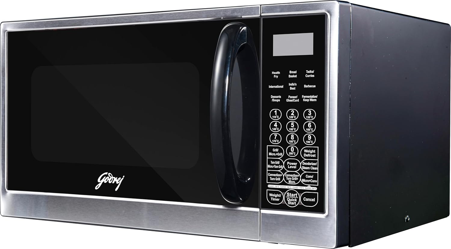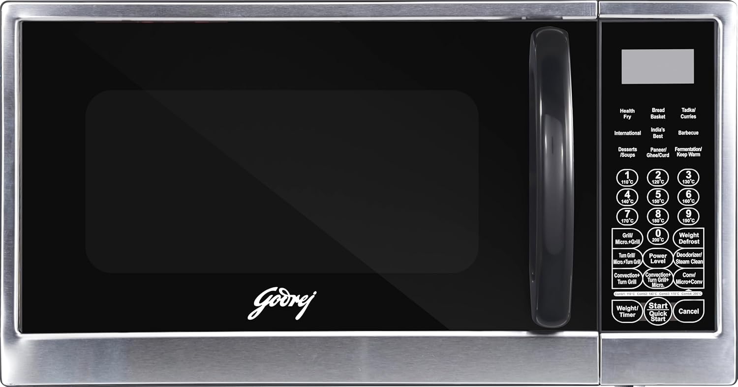 Special features: Steam clean | Stainless Steel Cavity | Multi Distribution System | Dual Grill Technology | Godrej Instachef App | 375 instacook recipes | Deodoriser Function | Defrost Function | Child lock | Rotissorie Rack