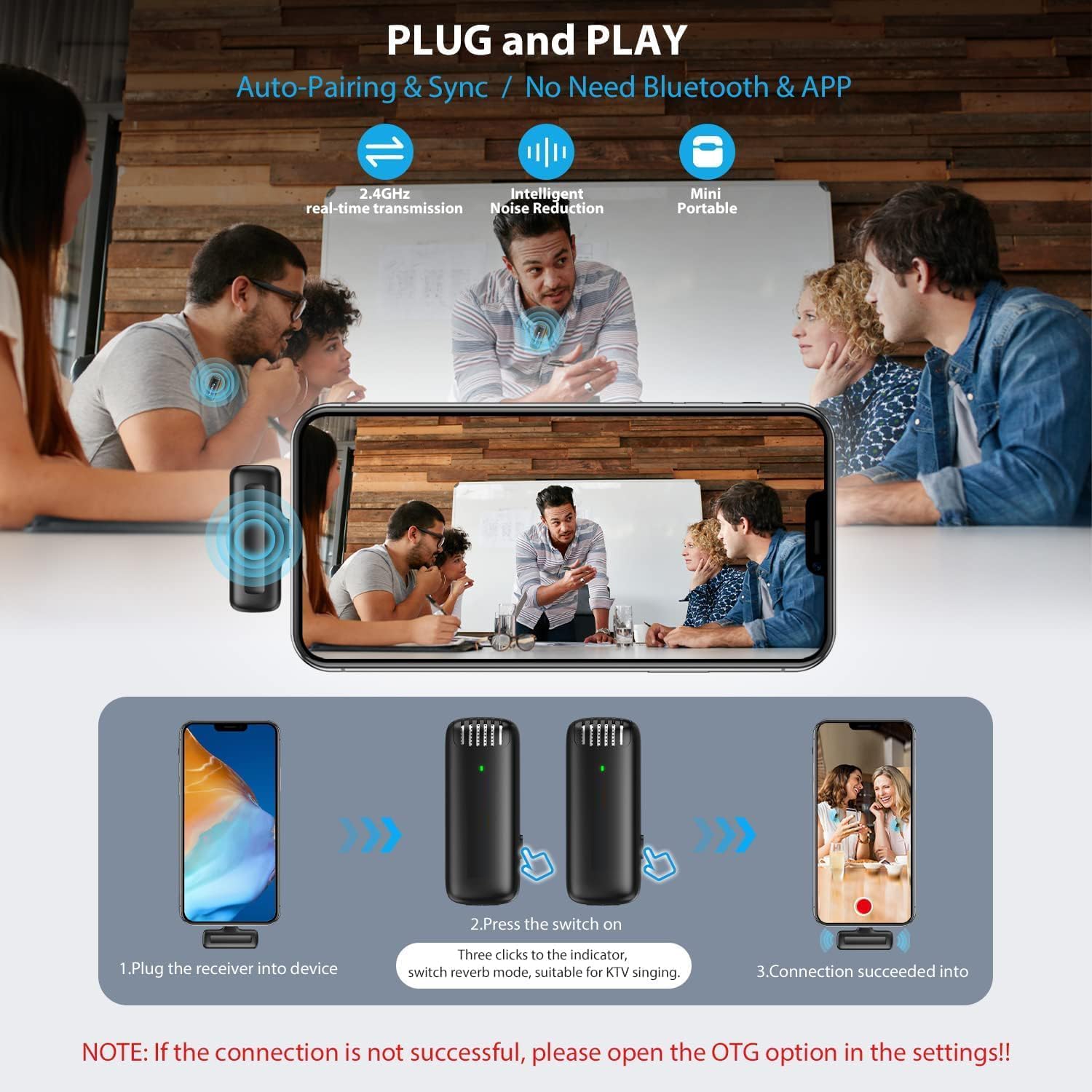 SECURINNOV Before you listen to the recorded video, you must unplug the receiver at first. The receive is compatible with Type-C port Android device and lightening port iOS device. This is not compatible with the Micro USB series !!)2.4GHz latest wireless transmission technology, fast, stable and effcient real-ime transmission.Built-in high sensitivity digital silicon, professional full band audio stereo CD sounds quality, rapid response, and greatly reduces the interference of the surrounding environment so that make the sound more clear. It can also capture more sound details to make your sound quality more vivid.Using 2.4GHz wireless transmission technology. With a delay of only 0.009s and strong penetrating power, so that barrier-free up to 20 meters.