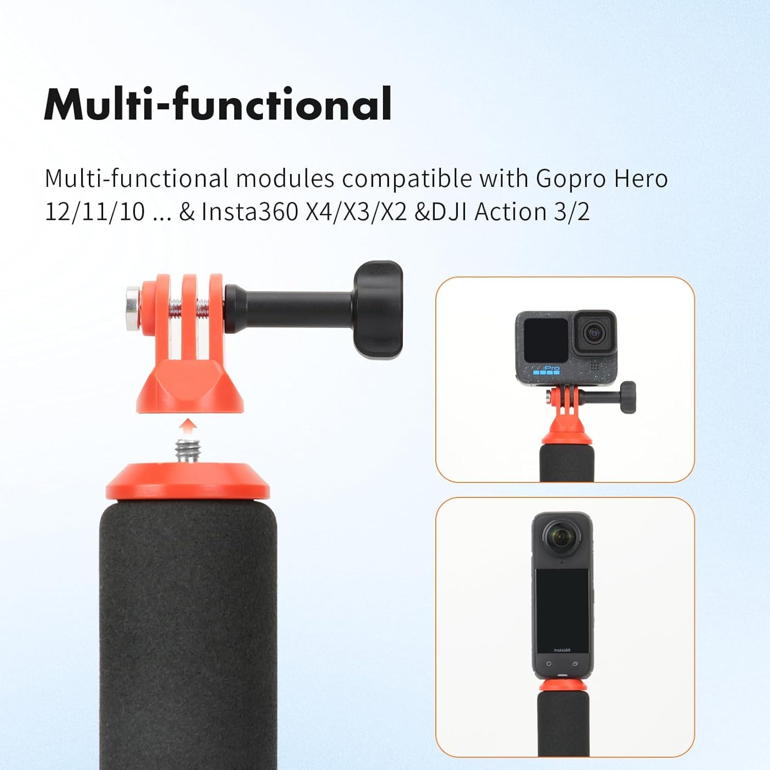【 Multi-functional 】 Floating Grip is designed with multi-functional modules that are compatible with sports cameras with standard interface such as Gopro Hero 12/11/10/9/8 and sports cameras with 1/4 thread interface such as Insta360 X4 X3 X2.