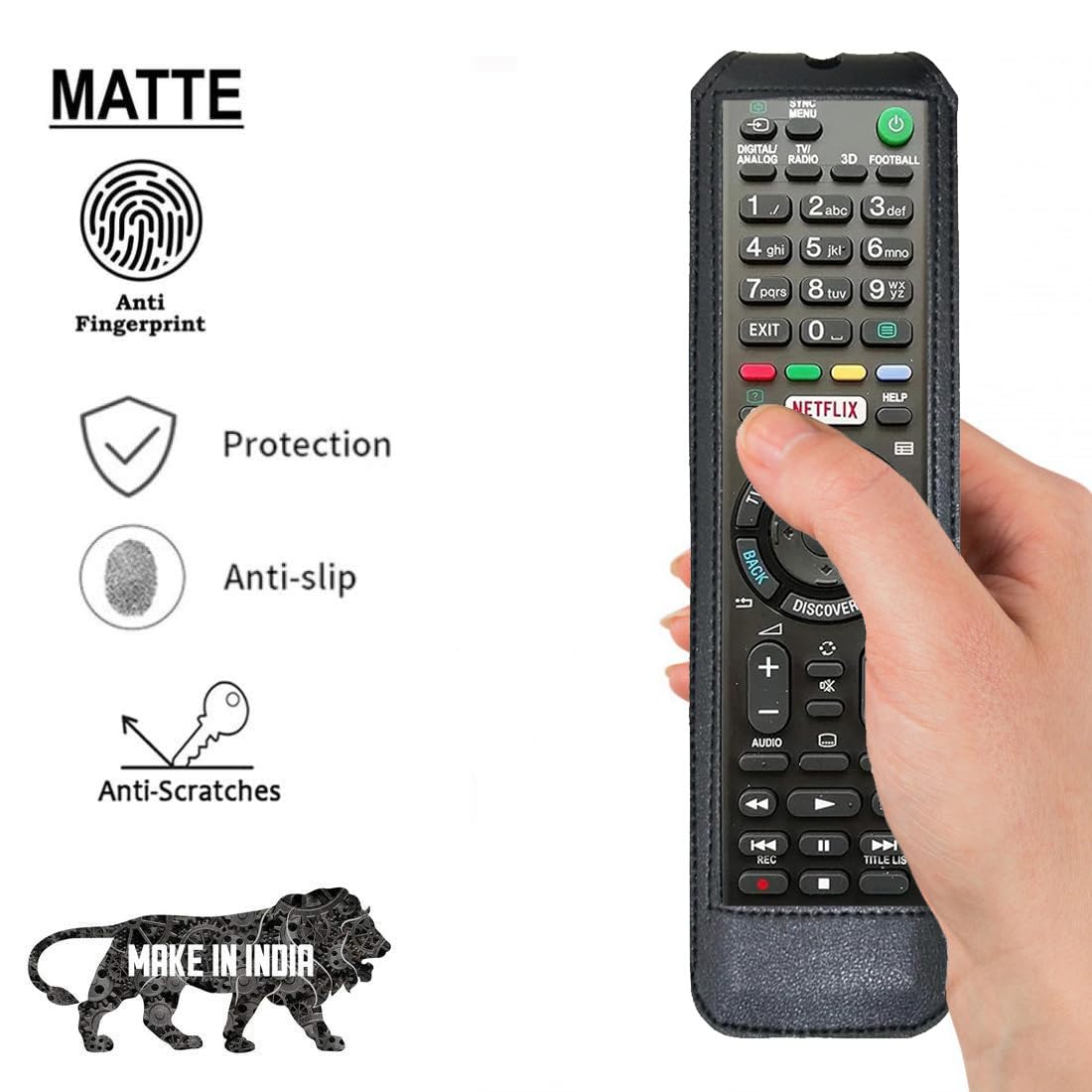 Premium synthetic leather with soft non-scratch microfiber interior. Provides protection for the remote against scratches, greasy dirt and abrasions.